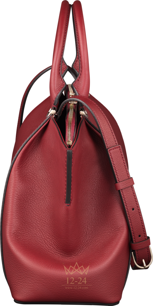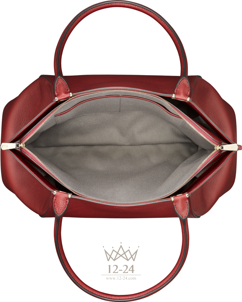 Сумка, маленькая модель, кожа теленка цвета красной шпинели, застежки-ручки с узором в виде буквы C, позолоченная отделка, на лицевой стороне надпись Cartier золотистого цвета, нанесенная методом горячего тиснения. Два боковых отделения, одно из них с плоским карманом, центральное отделение на молнии с двумя плоскими карманами. Подкладка из ткани серого цвета. Размеры: 24 х 34 х 13 см. Для ношения в руке или на плече. Съемный регулируемый ремень.