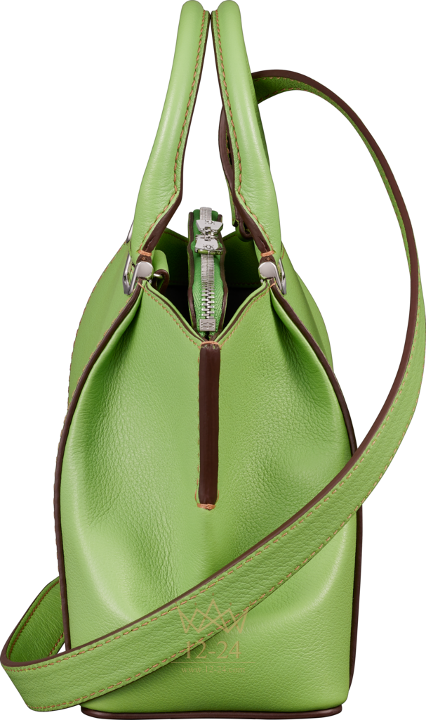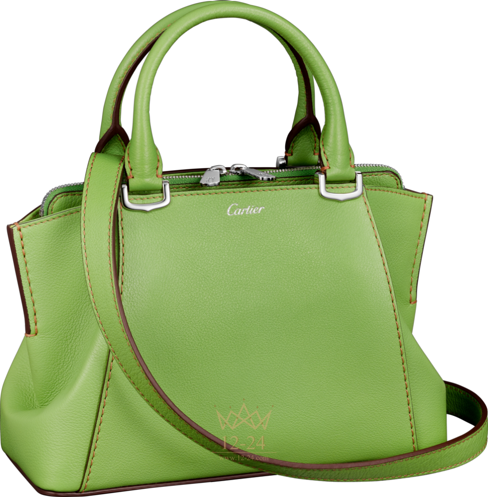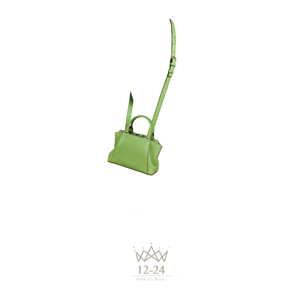 Ограниченная серия. Сумка, модель "мини", телячья кожа цвета перидота, застежки-ручки с узором в виде буквы C, палладиевая отделка, на лицевой стороне – надпись Cartier серебристого цвета, нанесенная методом горячего тиснения. Два боковых отделения, одно из них с плоским карманом, центральное отделение на молнии. Подкладка из ткани серого цвета. Размеры: 16 х 23 х 9,5 см. Для ношения в руке или на плече. Съемный регулируемый ремень.