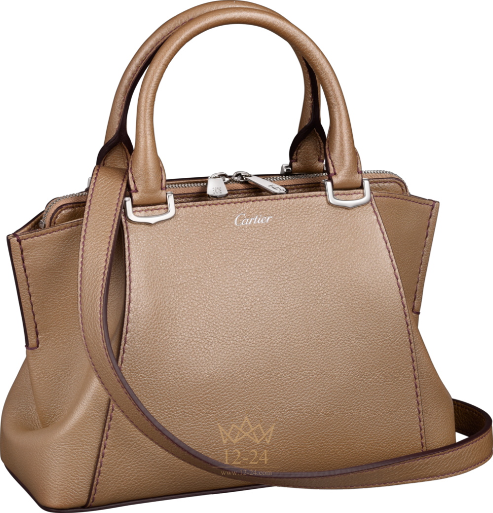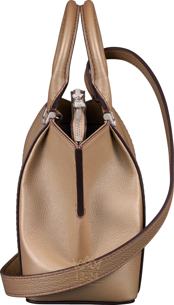 Ограниченная серия. Сумка, модель "мини", телячья кожа цвета золота, застежки-ручки с узором в виде буквы C, палладиевая отделка, на лицевой стороне – надпись Cartier серебристого цвета, нанесенная методом горячего тиснения. Два боковых отделения, одно из них с плоским карманом, центральное отделение на молнии. Подкладка из ткани серого цвета. Размеры: 16 х 23 х 9,5 см. Для ношения в руке или на плече. Съемный регулируемый ремень.