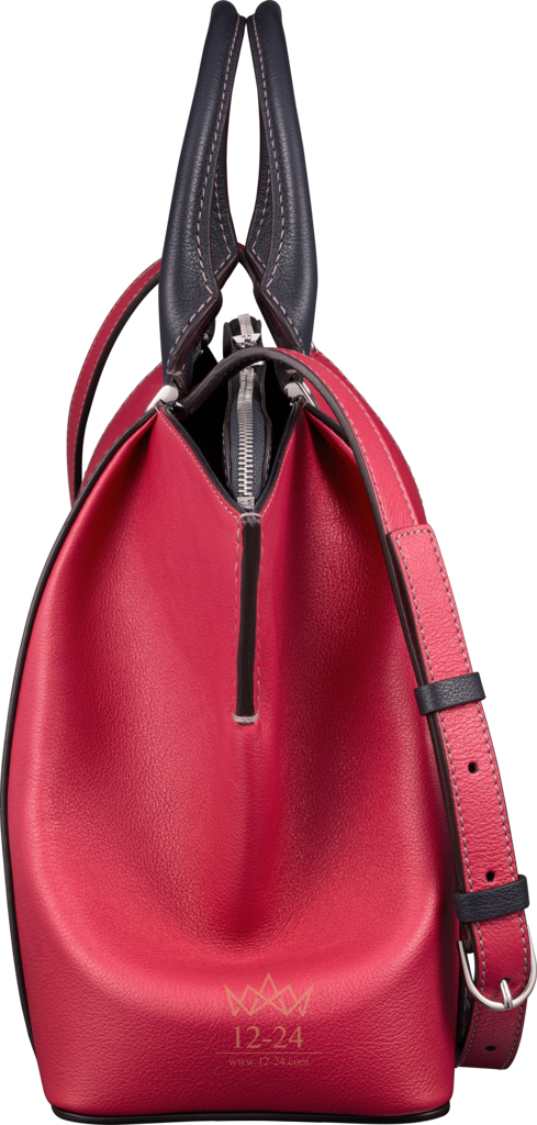 Ограниченная серия. Сумка, маленькая модель, телячья кожа цвета розового сапфира (основная часть) и цвета танзанита (основание, карман на молнии и ручки), застежки-ручки с узором в виде буквы C, палладиевая отделка, на лицевой стороне – надпись Cartier серебристого цвета, нанесенная методом горячего тиснения. Два боковых отделения, одно из них с плоским карманом, центральное отделение на молнии с двумя плоскими карманами. Подкладка из ткани серого цвета. Размеры: 24 х 34 х 13 см. Для ношения в руке или на плече. Съемный регулируемый ремень.