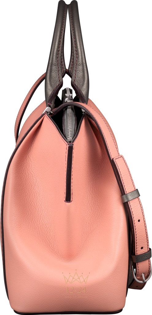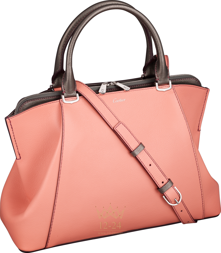 Ограниченная серия. Сумка, маленькая модель, телячья кожа цвета морганита (основная часть) и цвета дымчатого кварца (основание, карман на молнии и ручки), застежки-ручки с узором в виде буквы C, палладиевая отделка, на лицевой стороне – надпись Cartier серебристого цвета, нанесенная методом горячего тиснения. Два боковых отделения, одно из них с плоским карманом, центральное отделение на молнии с двумя плоскими карманами. Подкладка из ткани серого цвета. Размеры: 24 х 34 х 13 см. Для ношения в руке или на плече. Съемный регулируемый ремень.