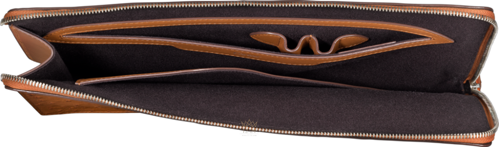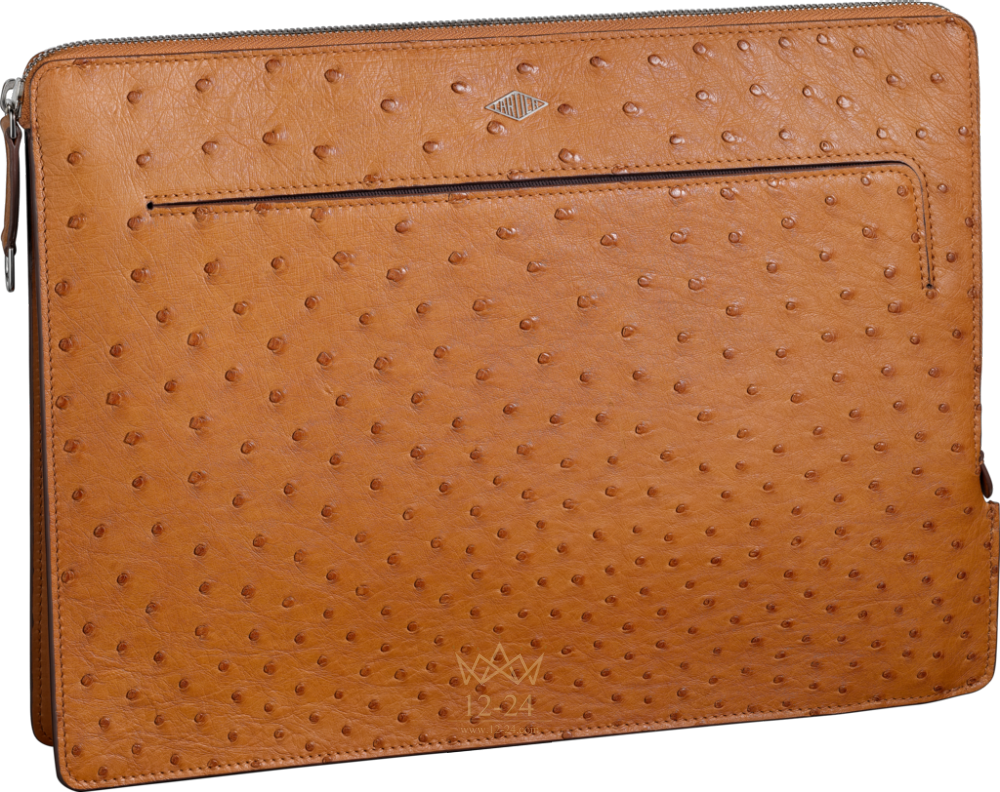 Ограниченная пронумерованная серия. Папка для документов, кожа страуса цвета карамели. Застежка-молния, металлические детали с палладиевой отделкой. Снаружи: логотип Cartier в виде ромба с палладиевой отделкой, 1 плоский карман на кнопке. Внутри: подкладка из ткани цвета эбенового дерева, 1 плоское отделение с 2 петлями для ручек, 1 карман из телячьей кожи цвета карамели для iPad. Тисненая надпись Cartier серебристого цвета. Размеры: 24,8 х 34,8 х 5 см. Для ношения в руке.