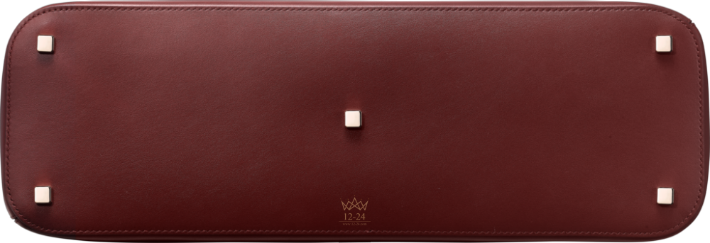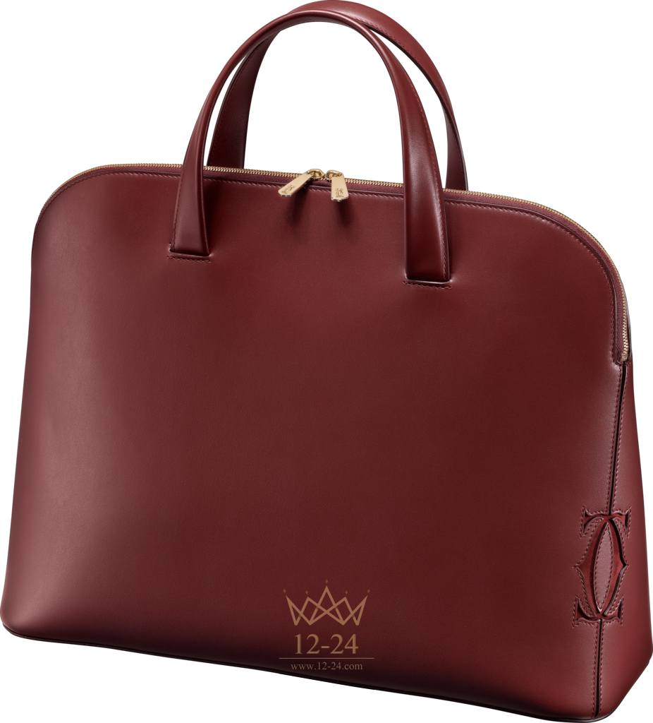 Сумка из телячьей кожи бордового цвета. Застежка-молния, металлические детали с позолоченной отделкой. Снаружи: логотип из бархата в виде двойной буквы С. Внутри: подкладка из микрофибры бордового цвета, 1 отделение на молнии и 2 плоских отделения из кожи бордового цвета. Внутри надпись Cartier золотистого цвета, нанесенная методом горячего тиснения. Размеры: 40 х 41 х 13,5 см. Ручки для ношения в руке и съемный ремень для ношения на плече.