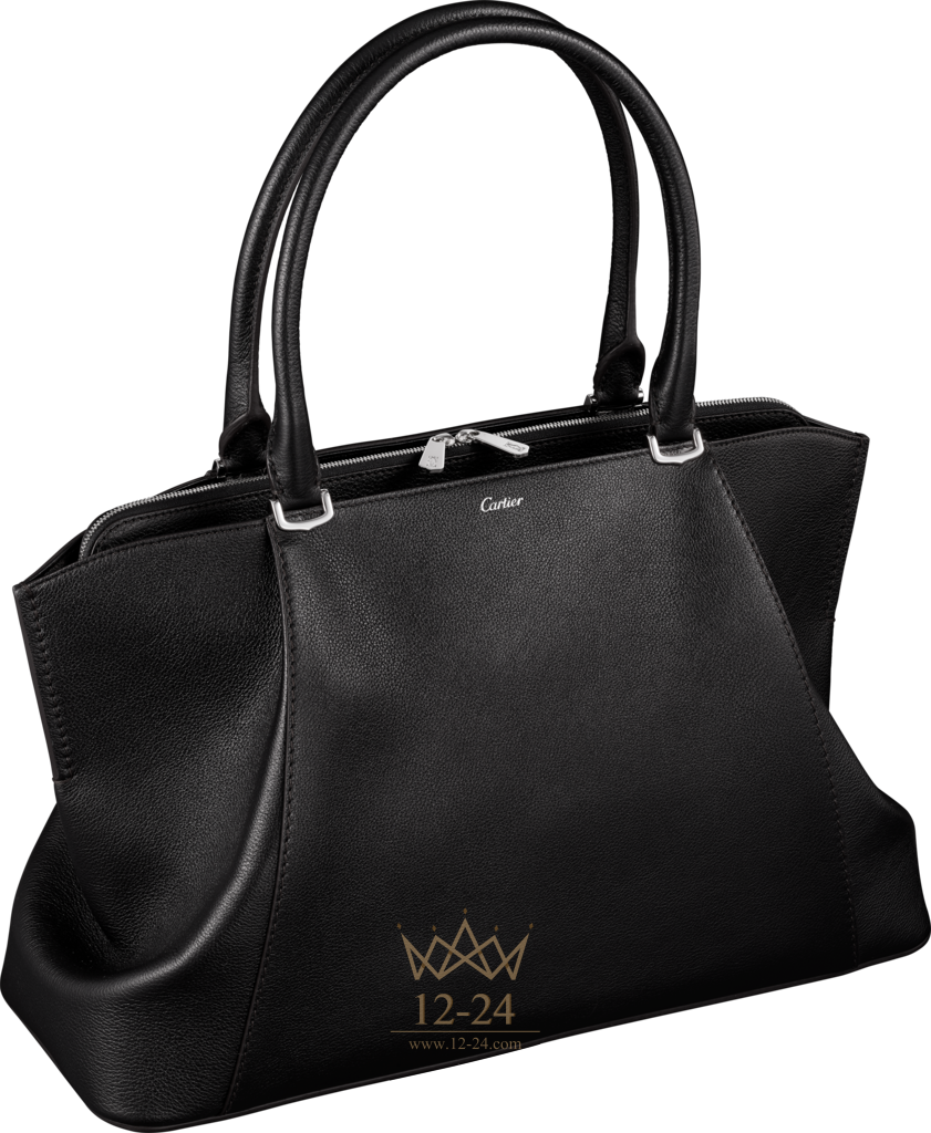 Сумка, модель среднего размера, телячья кожа цвета оникса, застежки-ручки с узором в виде буквы C, палладиевая отделка, на лицевой стороне надпись Cartier серебристого цвета, нанесенная методом горячего тиснения. Два боковых отделения, одно из них с плоским карманом, центральное отделение на молнии с двумя плоскими карманами. Подкладка из ткани серого цвета. Размеры: 26,5 х 41 х 16 см. Для ношения на плече.