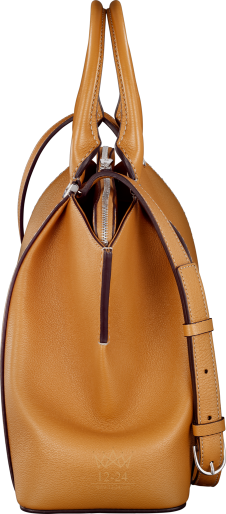Сумка, маленькая модель, телячья кожа цвета императорского топаза, застежки-ручки с узором в виде буквы C, палладиевая отделка, на лицевой стороне надпись Cartier серебристого цвета, нанесенная методом горячего тиснения. Два боковых отделения, одно из них с плоским карманом, центральное отделение на молнии с двумя плоскими карманами. Подкладка из ткани серого цвета. Размеры: 24 х 34 х 13 см. Для ношения в руке или на плече. Съемный регулируемый ремень.