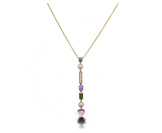 Колье Colour Collection с подвесками, желтое золото 18 карат, розовый турмалин, хризолит, аметист, голубой топаз, культивированный жемчуг Акойя, бриллиантовое паве.
