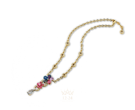 Колье Sapphire Flower, желтое золото 18 карат, цветные сапфиры, бриллианты, бриллиантовое паве.