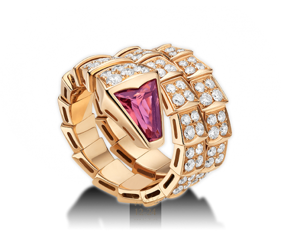 Кольцо Serpenti в два оборота, розовое золото 18 карат, рубеллит, сплошное бриллиантовое паве.