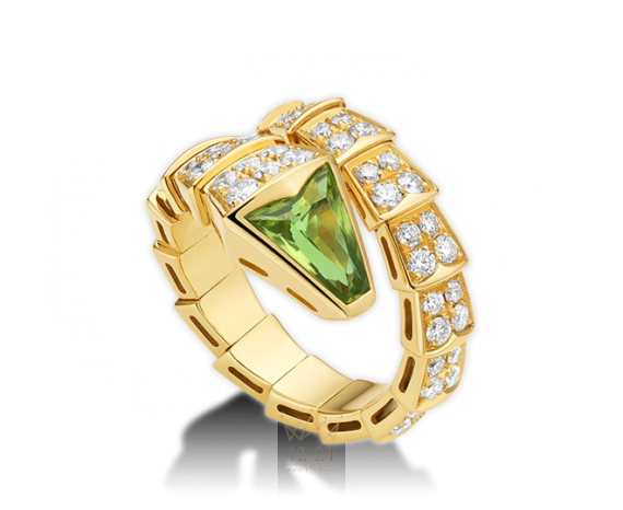 Кольцо Serpenti, желтое золото 18 карат, змеиная голова из хризолита, сплошное бриллиантовое паве.