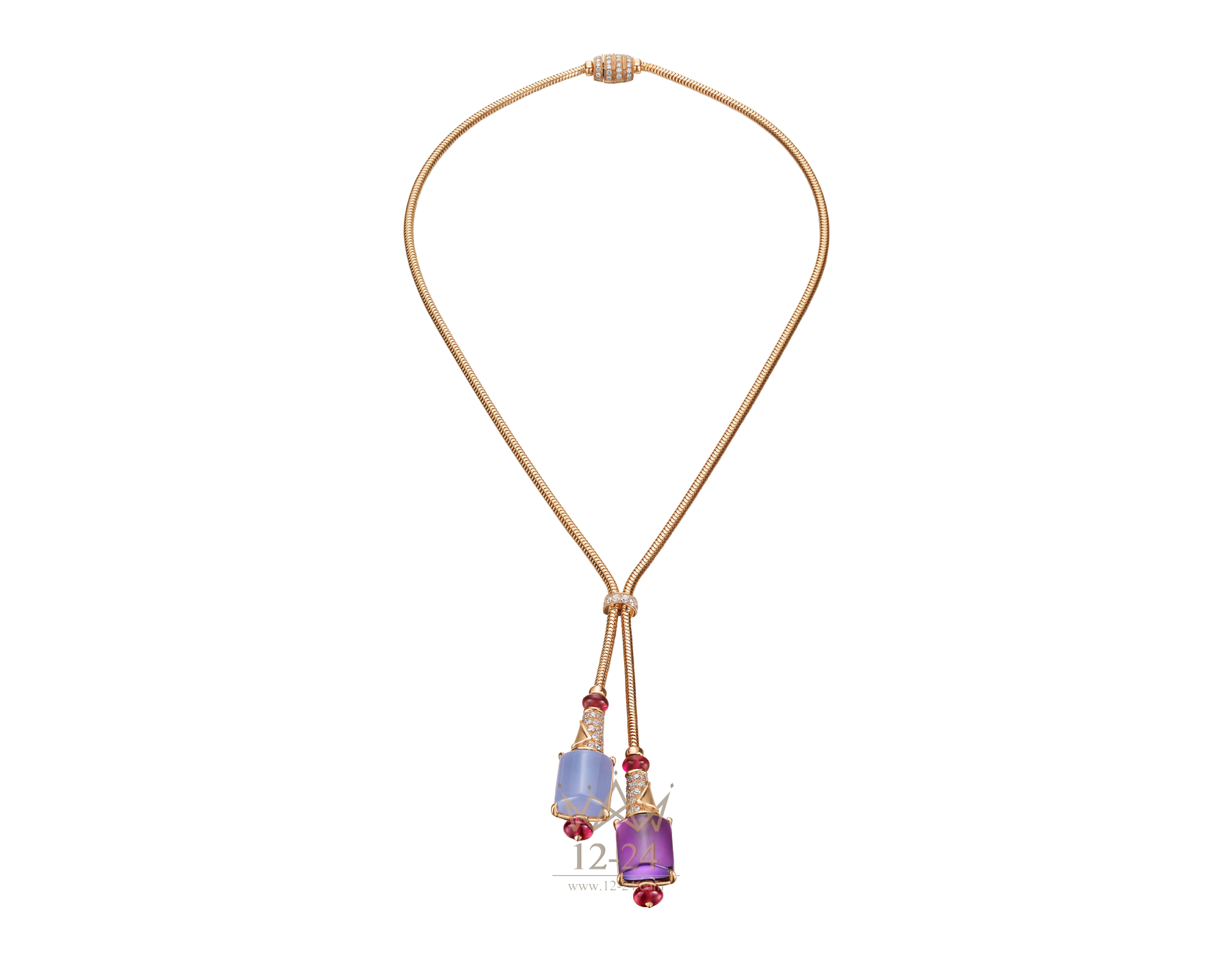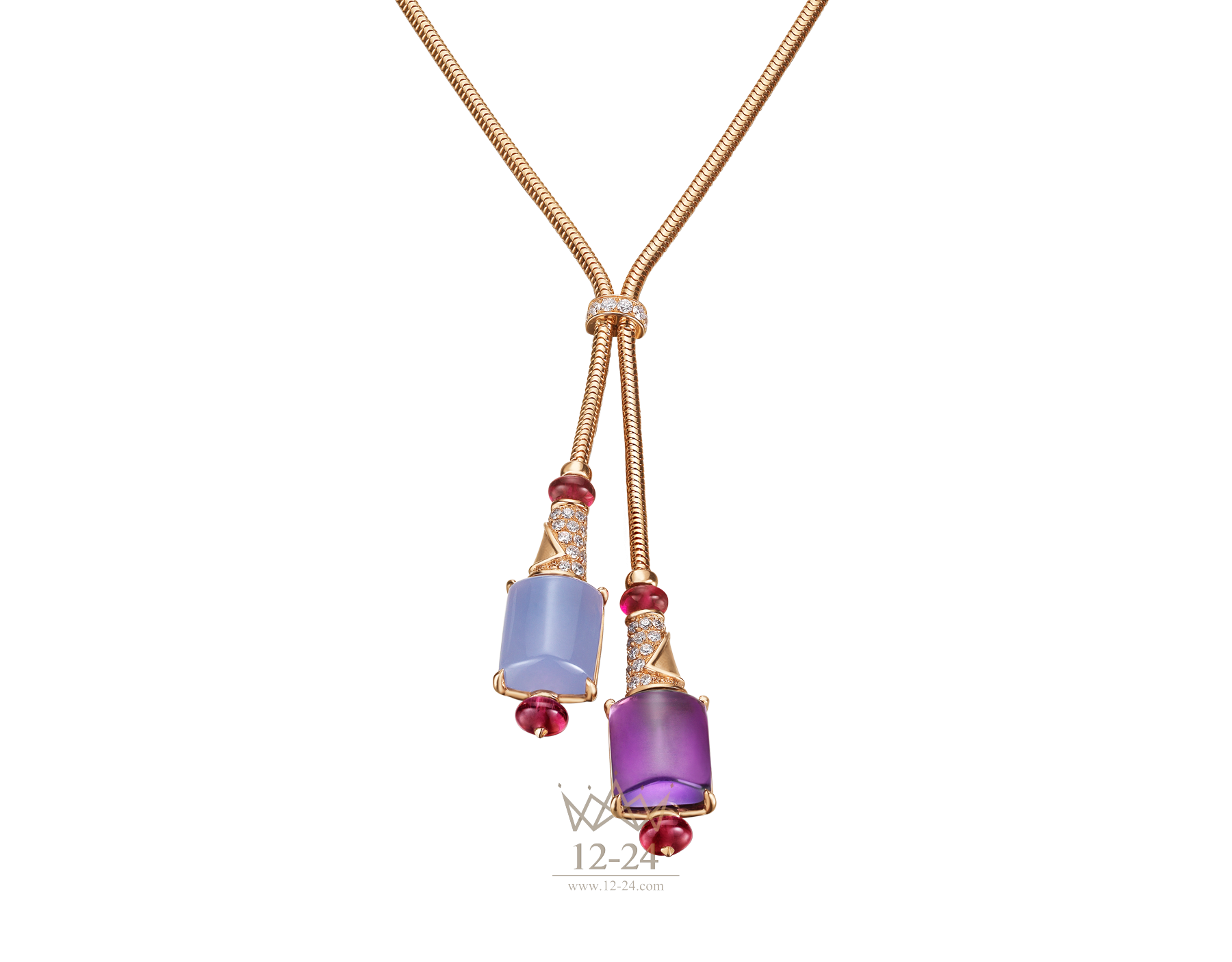 Колье MVSA, розовое золото 18 карат, аметист, халцедон, бусины из рубеллита, бриллиантовое паве.