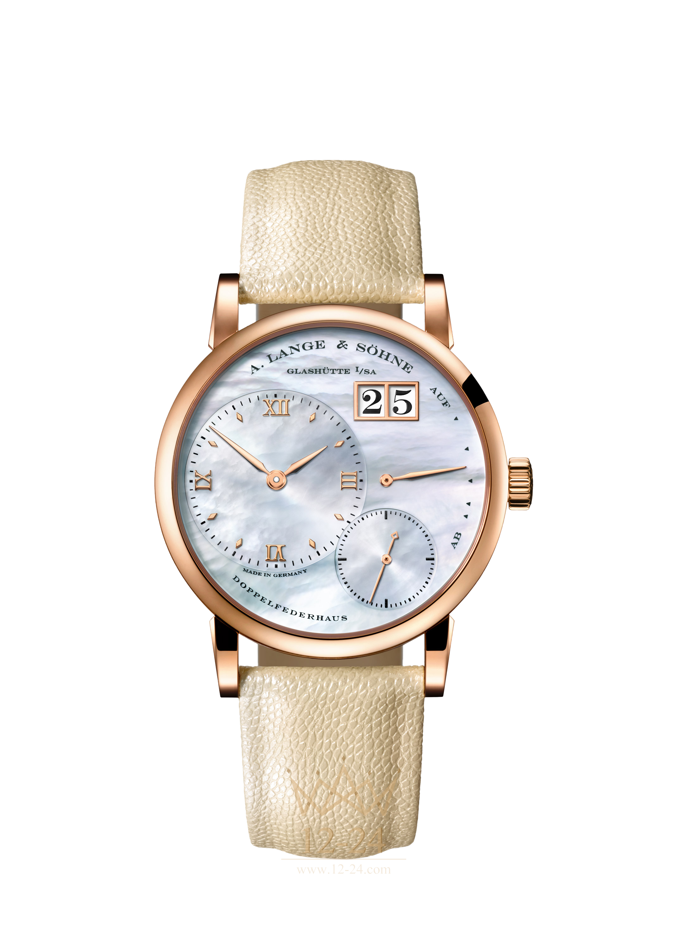Несмотря на компактный корпус, диаметр которого составляет лишь 36,1 мм, часы LITTLE LANGE 1 наделены всеми фирменными признаками LANGE 1 — циферблатом несимметричной структуры с непересекающимися шкалами и фирменным большим указателем даты. Сочетание корпуса из розового или белого золота с мерцающим голубым перламутровым циферблатом и ремешком из телячьей кожи с тонкой фактурой поверхности даёт новым моделям знаменитой коллекции LANGE 1 чрезвычайно элегантный вид.