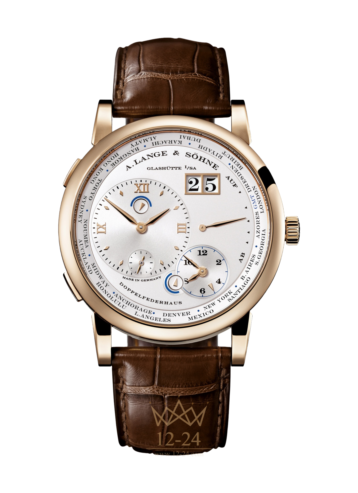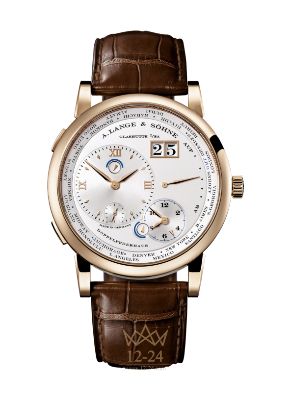 Часы Lange 1 TIME ZONE способны показывать местное время в одном из 24 часовых поясов и при этом сохранять время домашнего часового пояса. Периферийное кольцо с названиями городов, которое удобно переключается специальной кнопкой, позволяет легко установить время нужного часового пояса.