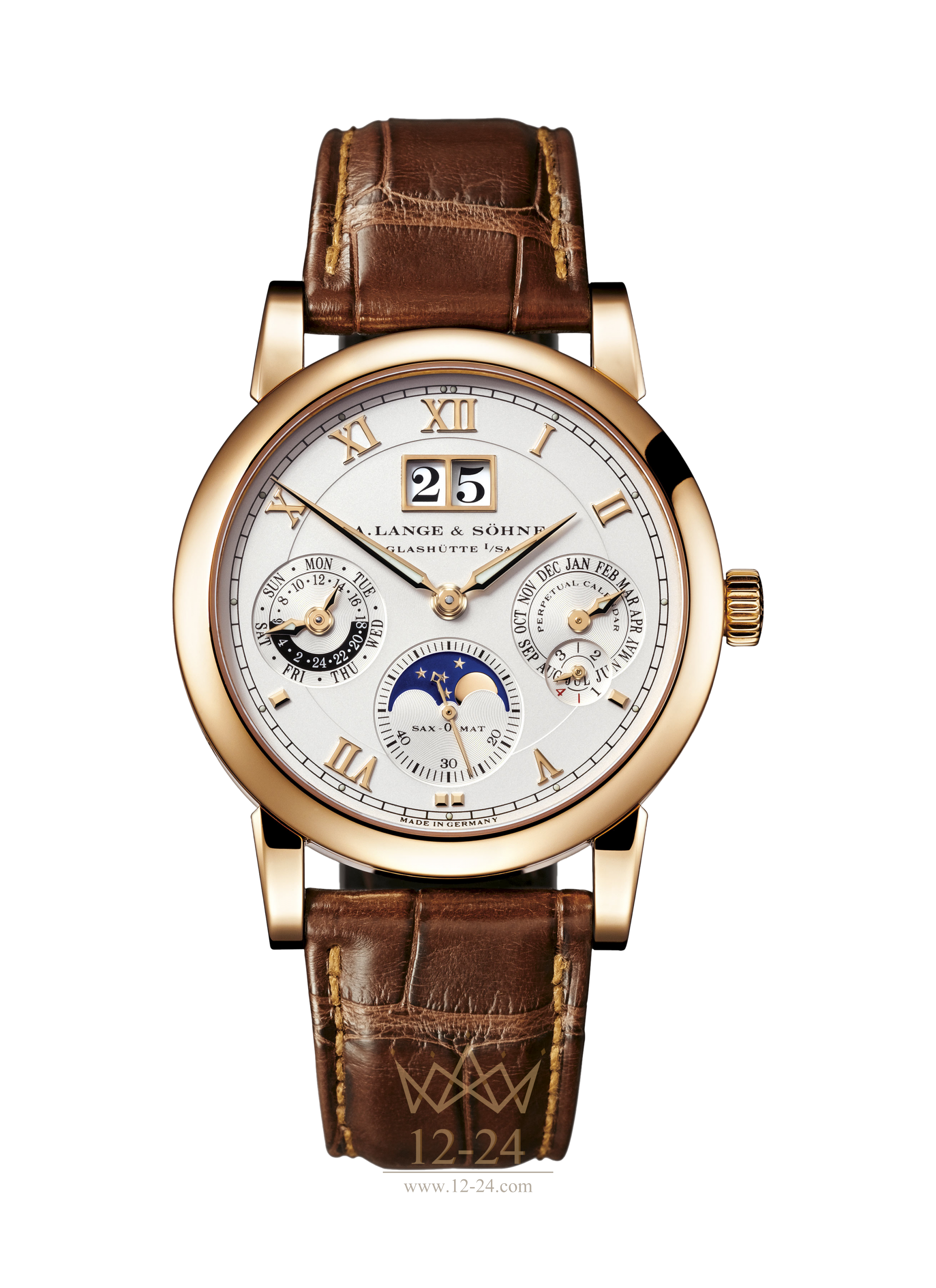 LANGEMATIKPERPETUAL — первые механические наручные часы, в которых вечный календарь оснащён большим указателем даты Lange. Механизм вечного календаря автоматически показывает верные дату, день недели и месяц, учитывая различные длительности месяцев, включая вариации високосного цикла.