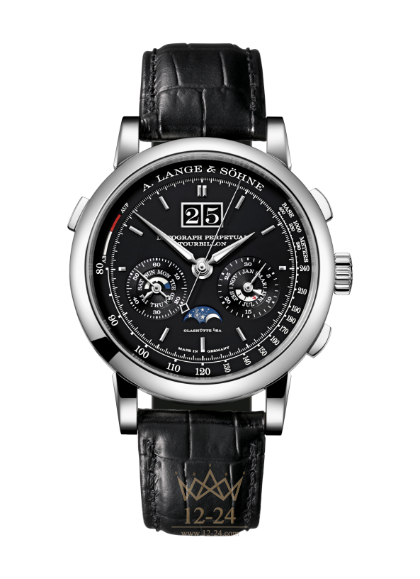 В часах DATOGRAPH PERPETUAL TOURBILLON объединены три серьёзных сложных устройства: возвратный хронограф с минутным счётчиком прецизионного мгновенного переключения, вечный календарь с указателями мгновенного переключения и турбийон с запатентованным механизмом остановки секундной стрелки. Элегантность чёрного циферблата классического дизайна дополняется технической функциональностью. Часы выпущены лимитированной серией из 100 платиновых экземпляров.