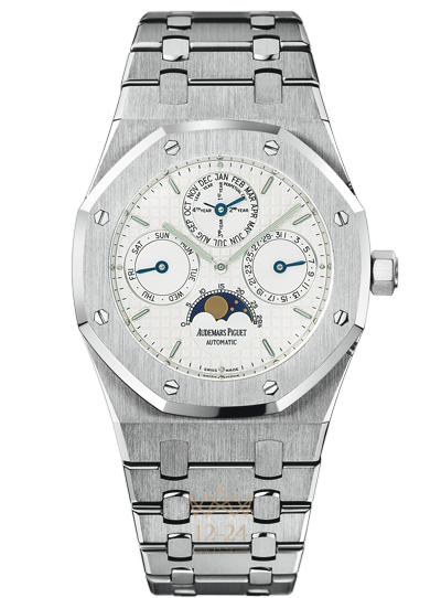 Часы Perpetual Calendar с автоподзаводом, Вечный календарь с указателями дня недели, даты, месяца и года в високосном цикле, корпус и браслет из нержавеющей стали, сапфировое стекло с антибликовым покрытием, посеребренный циферблат модели "Grande Tapisserie".