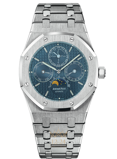Часы Perpetual Calendar с автоподзаводом, Вечный календарь с указателями дня недели, даты, месяца и года в високосном цикле, корпус и браслет из нержавеющей стали, сапфировое стекло с антибликовым покрытием, циферблат модели "Grande Tapisserie" серо - голубого цвета.