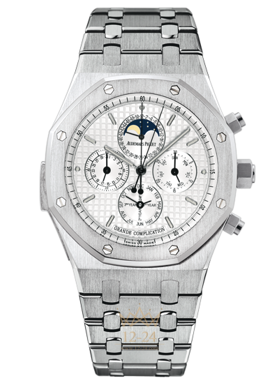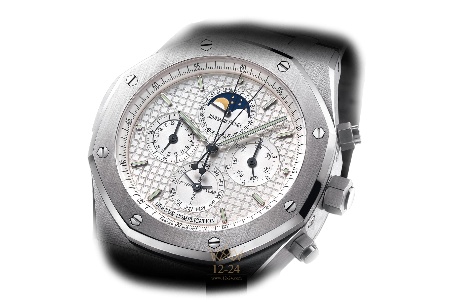 Часы GRANDE COMPLICATION с автоподзаводом, корпус и браслет из 18 каратного белого золота, сапфировое стекло и задняя крышка, посеребренный циферблат модели "Grande Tapisserie", вечный календарь с указанием (даты, дня недели, месяца, фазы луны и високосного года), сплит - хронограф, минутный репетир, малая секундная стрелка.
