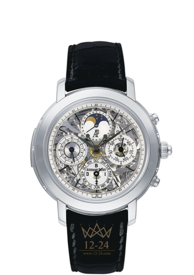 Часы Grande Complication с автоподзаводом. Вечный календарь с указанием даты, дня недели, недели, месяца, фазы луны и високосного года, часы и минуты, сплит-хронограф, минутный репетир, маленькая секундная стрелка. Платиновый корпус, сапфировый циферблат скелетон, белые индикационные шкалы, сапфировые стекло и задняя крышка с анти-бликовым покрытием. Черный ремешок ручной работы из кожи аллигатора с титановой застежкой.