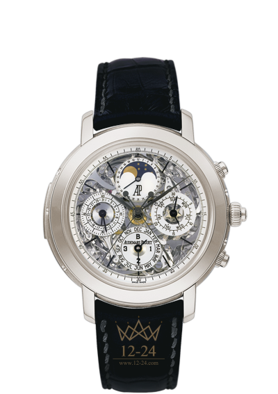 Часы Grande Complication с автоподзаводом. Вечный календарь с указанием даты, дня недели, недели, месяца, фазы луны и високосного года, часы и минуты, сплит-хронограф, минутный репетир, маленькая секундная стрелка. Титановый корпус, сапфировый циферблат скелетон, белые индикационные шкалы, сапфировые стекло и задняя крышка с анти-бликовым покрытием. Черный ремешок ручной работы из кожи аллигатора с титановой застежкой.