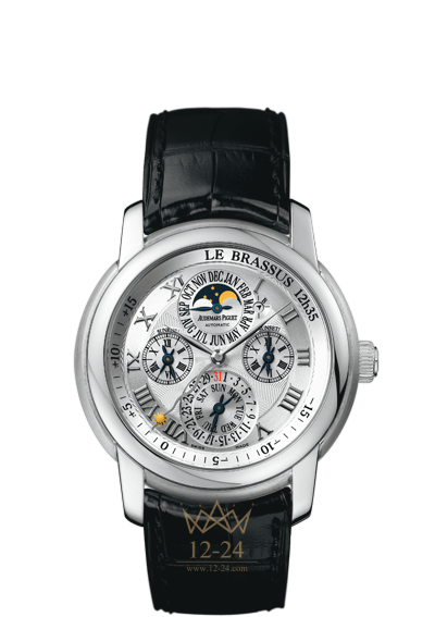 Часы Equation of time. С автоподзаводом, время восхода и захода Солнца, уравнивание времени, вечный календарь, астрономическая индикация фаз луны, часов и минут. Корпус из белого золота, сапфировые стекло и задняя крышка с анти-бликовым покрытием, серебристый циферблат. Черный ремешок ручной работы из кожи аллигатора, застежка из белого золота.