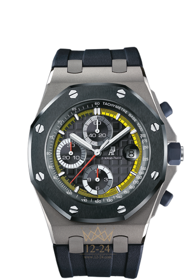 Часы Сhronograph SÉBASTIEN BUEMI с автоподзаводом, индикацией даты и маленько секундной стрелкой, титановый корпус, сапфировое стекло с анти-бликовым покрытием, задняя крышка с гравировкой легенде "Royal Oak Offshore Limited Edition - Себастьен Буэми", черный керамический бензель, черный циферблат модели "Мега Tapisserie", черный каучуковый ремешок с титановой застежкой.