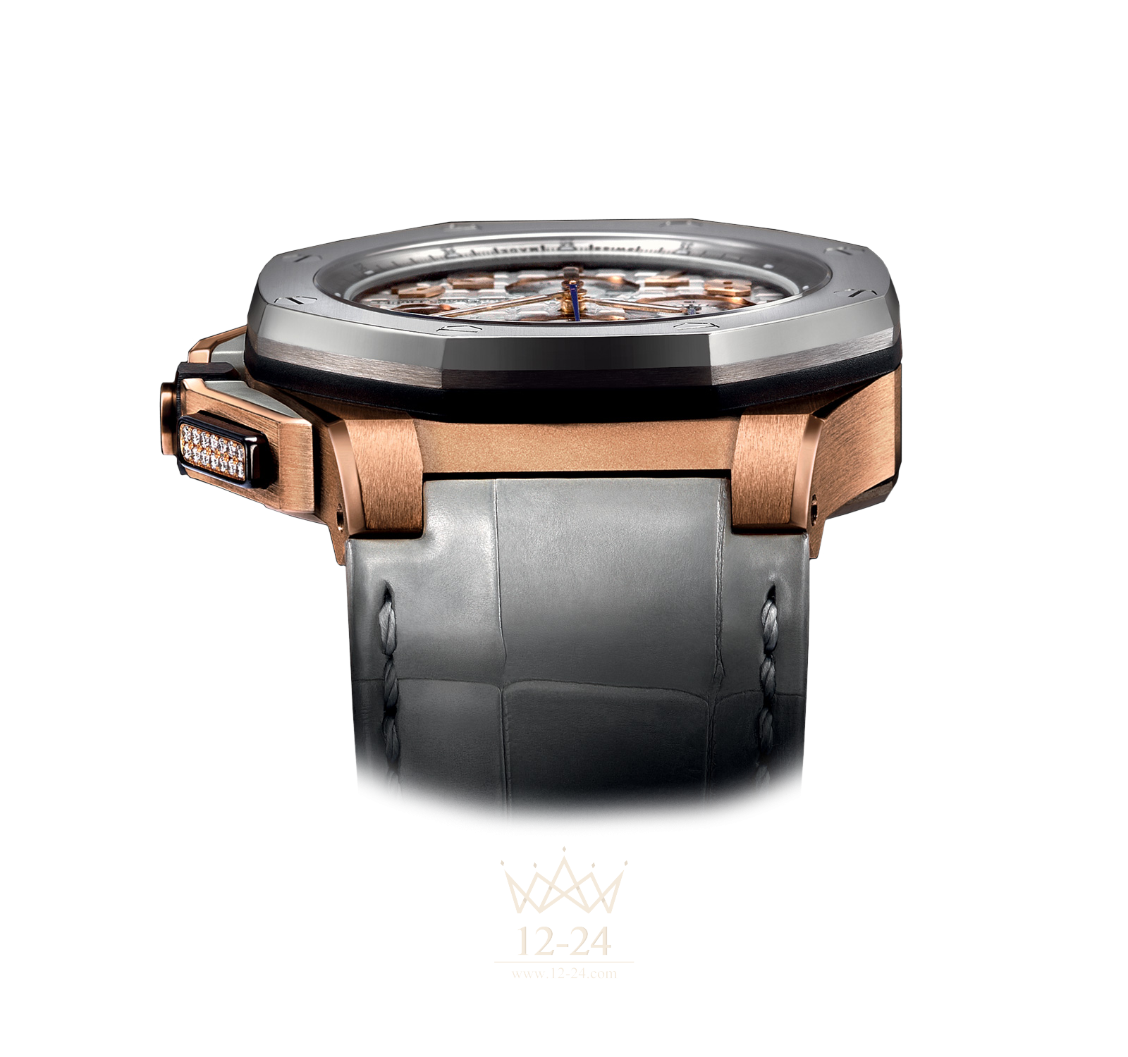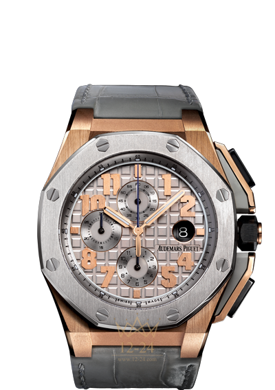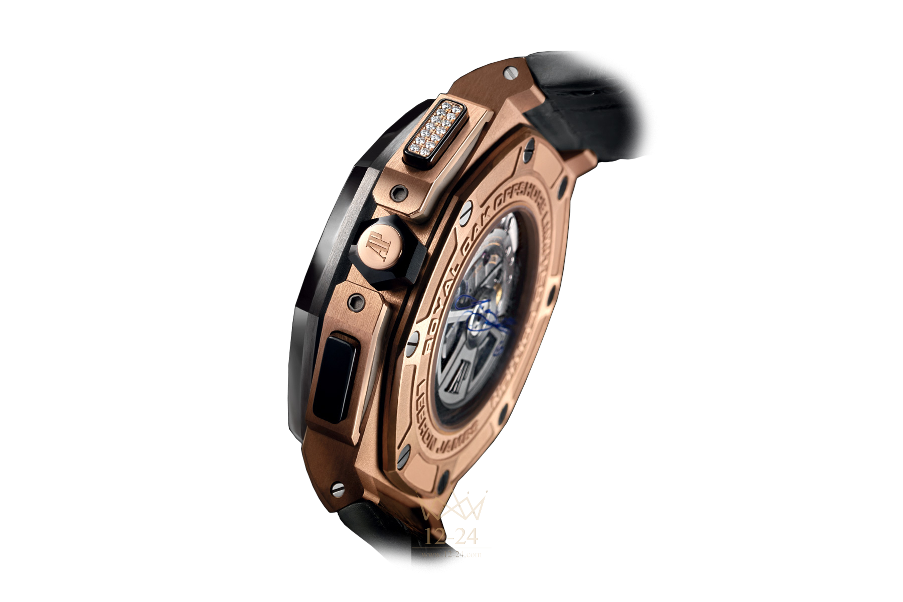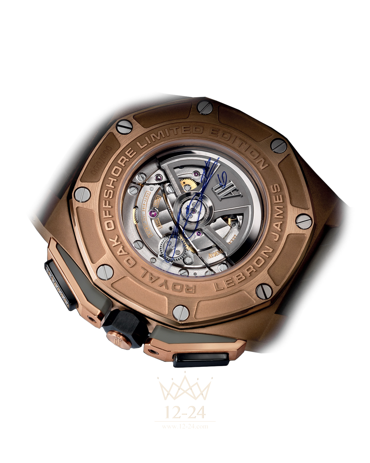 Часы CHRONOGRAPH LEBRON JAMES с автоподзаводом, индикацией даты и маленькой секундной стрелкой, корпус из 18 каратного розового золота, стекло сапфировое с анти-бликовым покрытием, задняя крышка с гравировкой легенды "Royal Oak Offshore Limited Edition Леброн Джеймс», подпись Линдона Джонсана печатным синим цветом на сапфировом стекле, алмазные кнопки, титановая рамка, циферблат модели "Мега Tapisserie", арабские цифры из розового золота, серый ремешок из кожи аллигатора с пряжкой из розового золота (дополнительный серый резиновый ремешок).