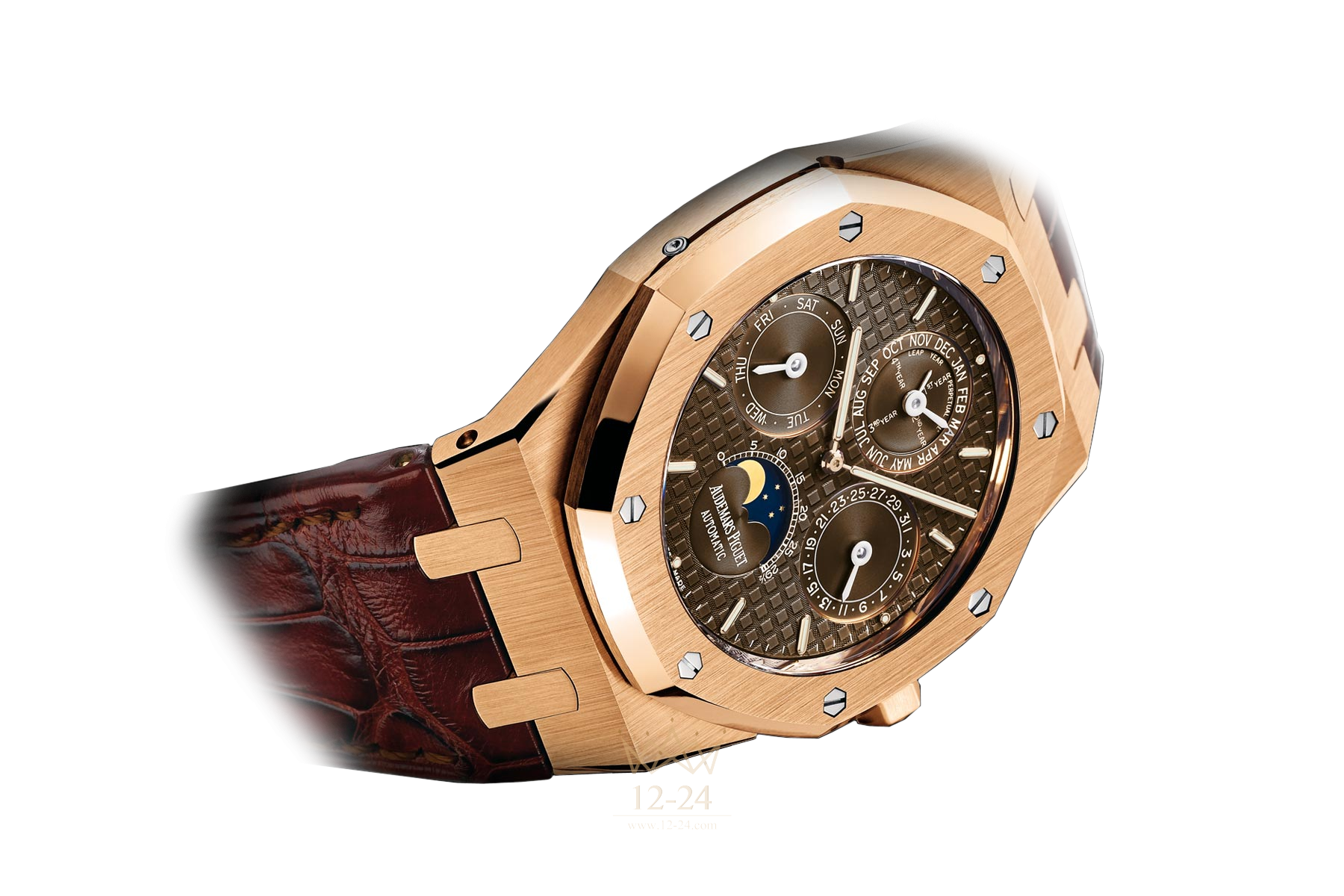Часы Perpetual Calendar с автоподзаводом, Вечный календарь с указателями дня недели, даты, месяца и года в високосном цикле, корпус из нержавеющей стали, сапфировое стекло с антибликовым покрытием, коричневый ремешок из кожи аллигатора, циферблат модели "Grande Tapisserie" цвета - коричневый шоколад.