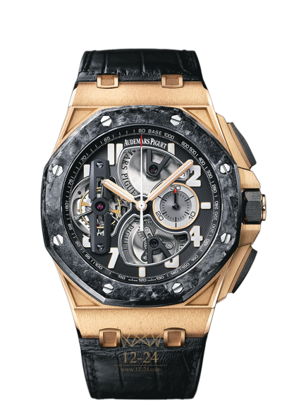 Часы Tourbillon Chronograph корпус из 18 каратного розового золота, сапфировое стекло и задняя крышка с анти-бликовым покрытием, открытый черный циферблат, черный ремешок из кожи аллигатора с застежкой из розового золота.