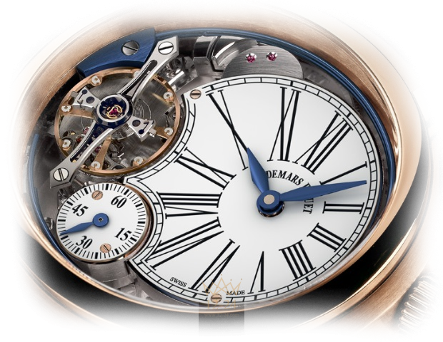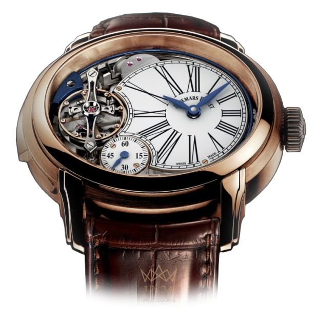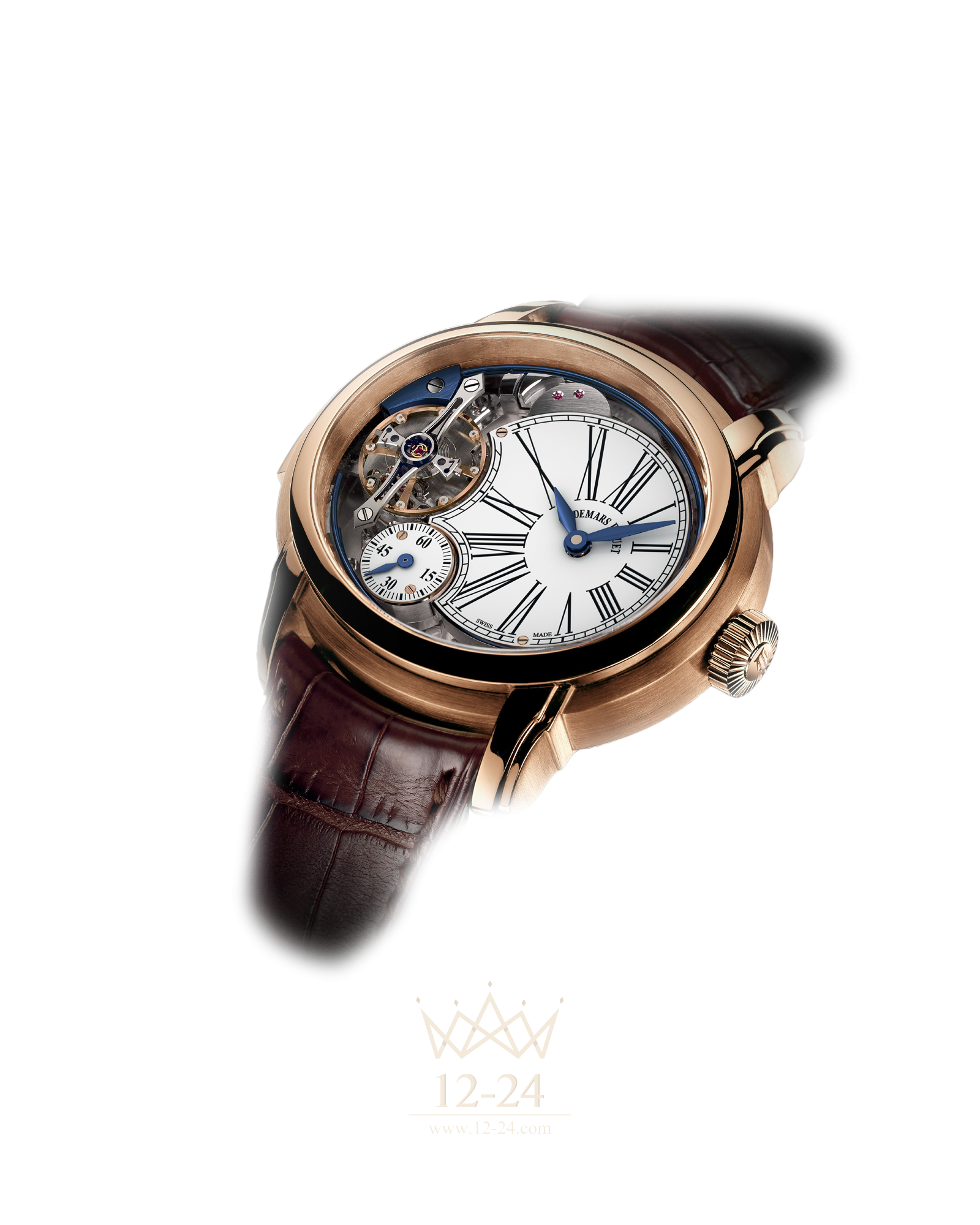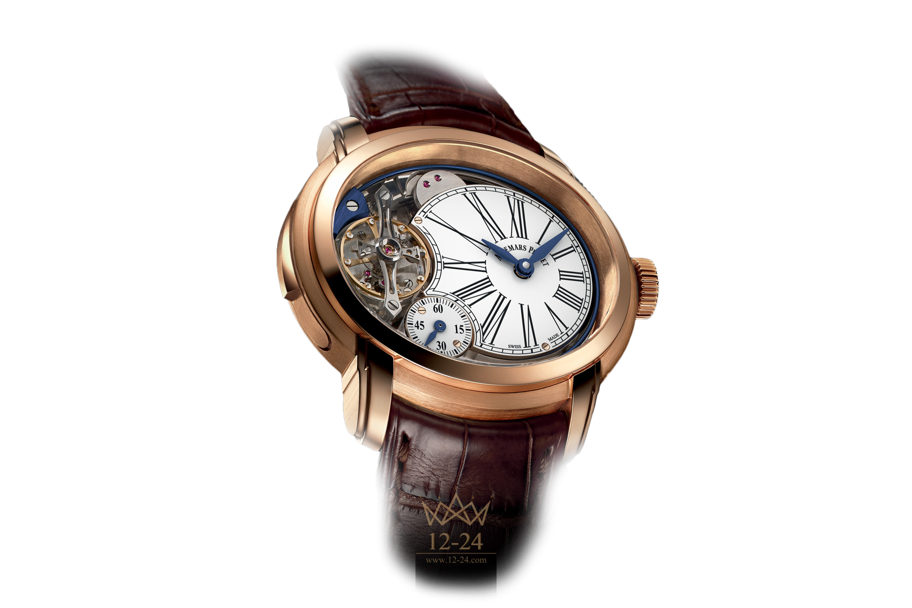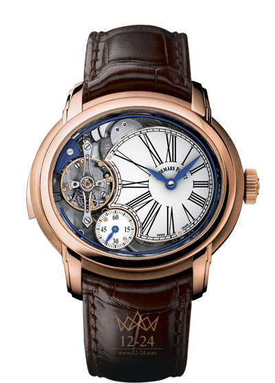 Часы Minute Repeater с ручным заводом, минутным репетиром и меленькой секундной стрелкой. Корпус из 18 каратного розового золота, сапфировые стекло и задняя крышка с анти-бликовым покрытием, коричневый ремешок из кожи аллигатора с застежкой из розового золота.