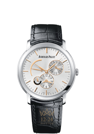 Часы Dual Time с автоматическим подзаводом. Сапфировое стекло с анти-бликовым покрытием. Второй часовой пояс, 24 - часовая индикация часов, минут, даты, запас хода. Корпус из белого золота 750 - пробы. Серебристый циферблат, часовые метки выполнены из розового золота, черный ремешок ручной работы из кожи аллигатора, раскладная застежка из белого золота.