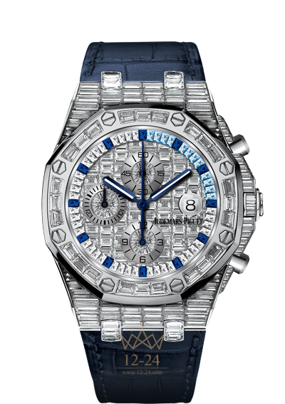 Часы CHRONOGRAPH корпус из 18 каратного белого золота проложенного бриллиантами, сапфировое стекло и задняя крышка, завинчивающаяся заводная головка с бриллиантами багетной огранки, циферблат из 18 каратного белого золота с бриллиантами, внутренний безель с бриллиантами и синими сапфирами багетной огранки, синий ремешок из кожи аллигатора с застежкой из 18 каратного белого золота и бриллиантами (дополнительный черный ремешок из кожи аллигатора), хронограф с индикацией даты.