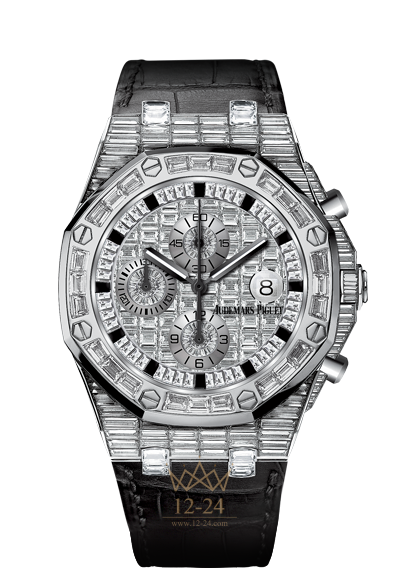 Часы CHRONOGRAPH корпус из 18 каратного белого золота проложенного бриллиантами, сапфировое стекло и задняя крышка, завинчивающаяся заводная головка с бриллиантами багетной огранки, циферблат из 18 каратного белого золота с бриллиантами, внутренний безель с бриллиантами багетной огранки и багетной огранки оникса, черный ремешок из кожи аллигатора с застежкой из 18 каратного белого золота и бриллиантами, хронограф с индикацией даты.