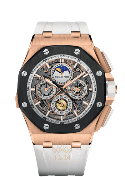 Часы Grande Complication с автоподзаводом, вечный календарь с указанием дня, даты, недели, фазы луны и високосного года, минутный репетир, сплит-хронограф, малая секундная стрелка, корпус из 18 каратного розового золота, сапфировое стекло и задняя крышка с анти-бликовым покрытием, циферблат из дымчатого сапфира, белый каучуковый ремешок с пряжкой из розового золота.
