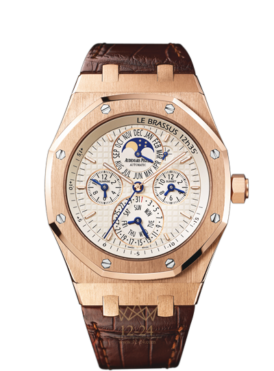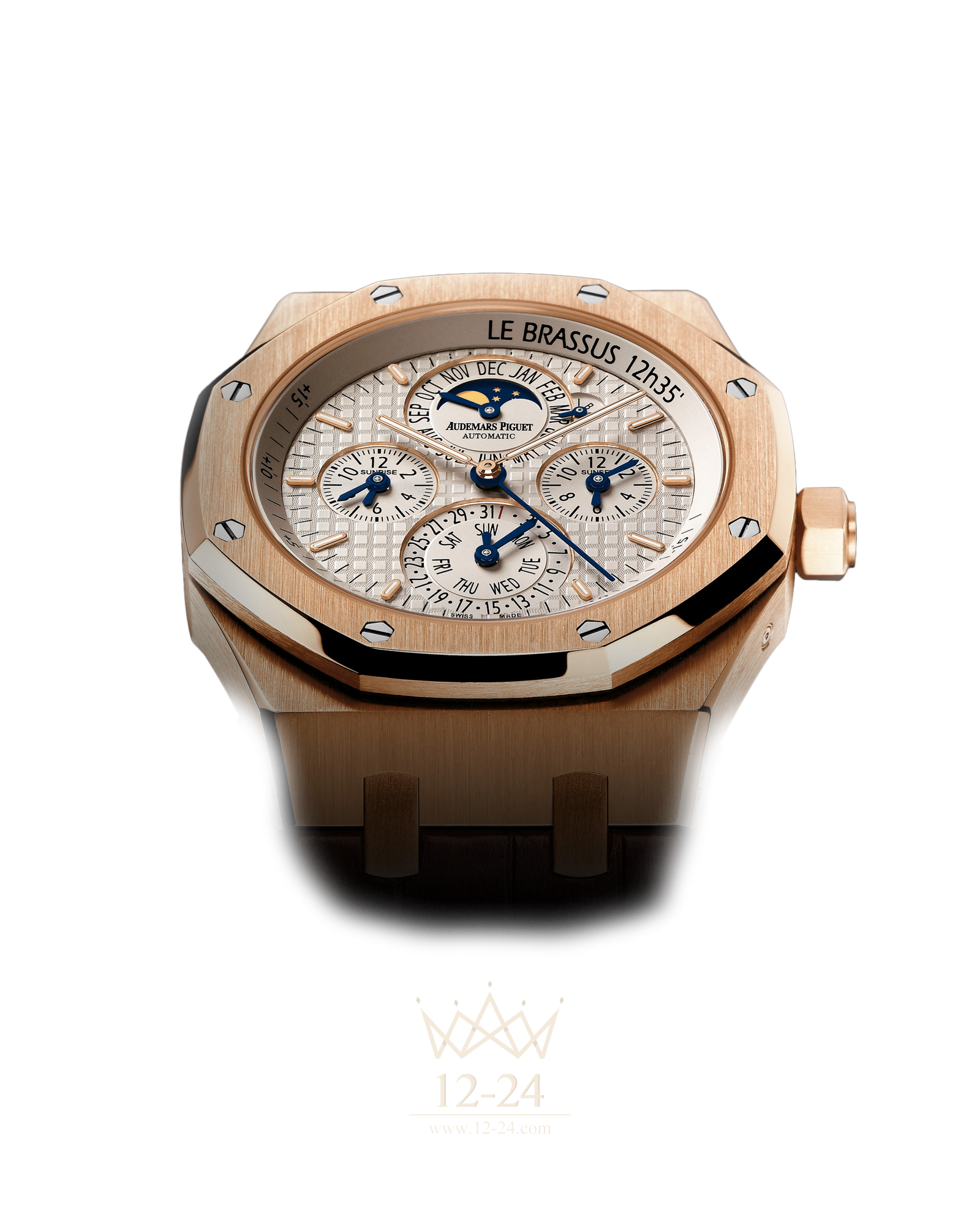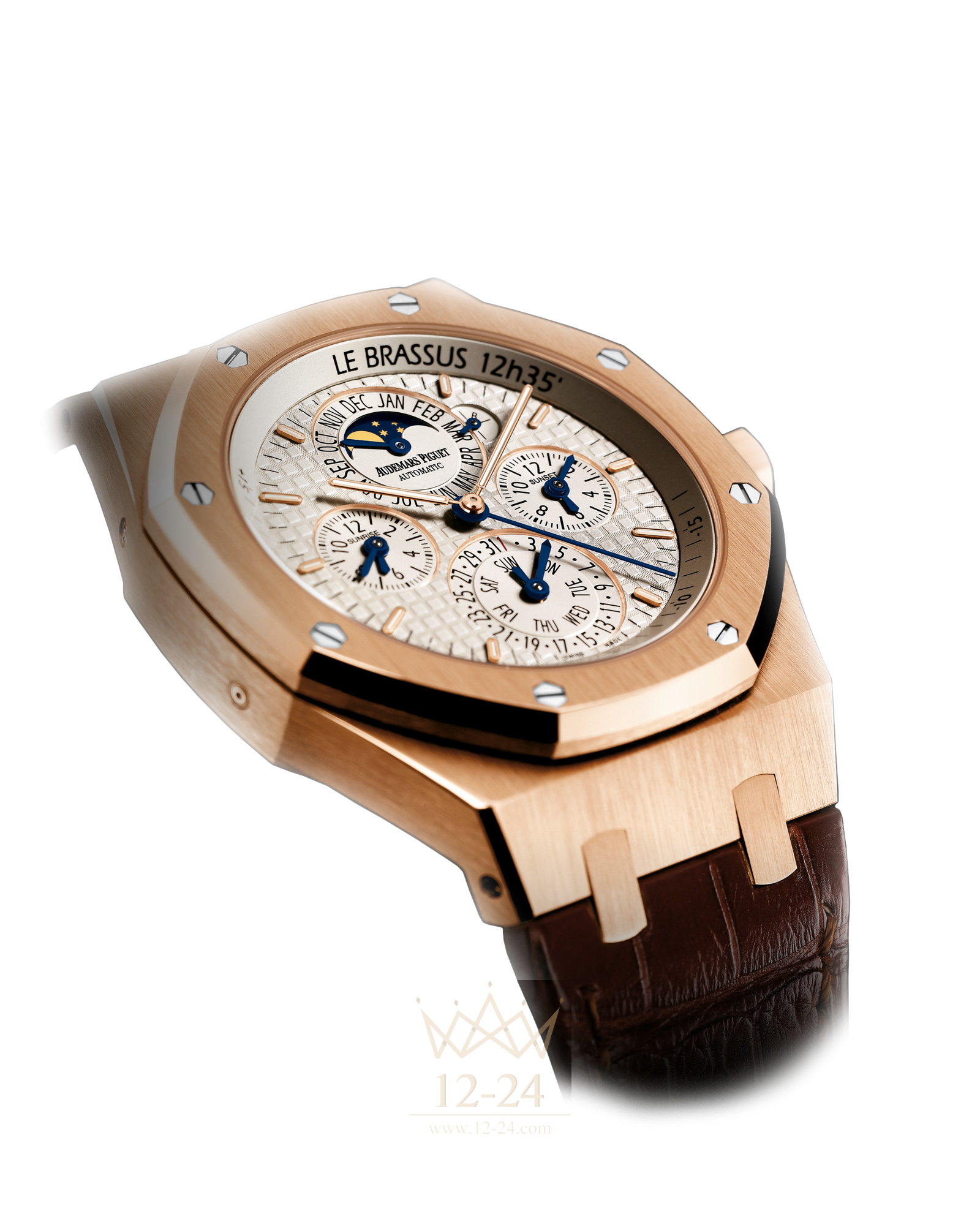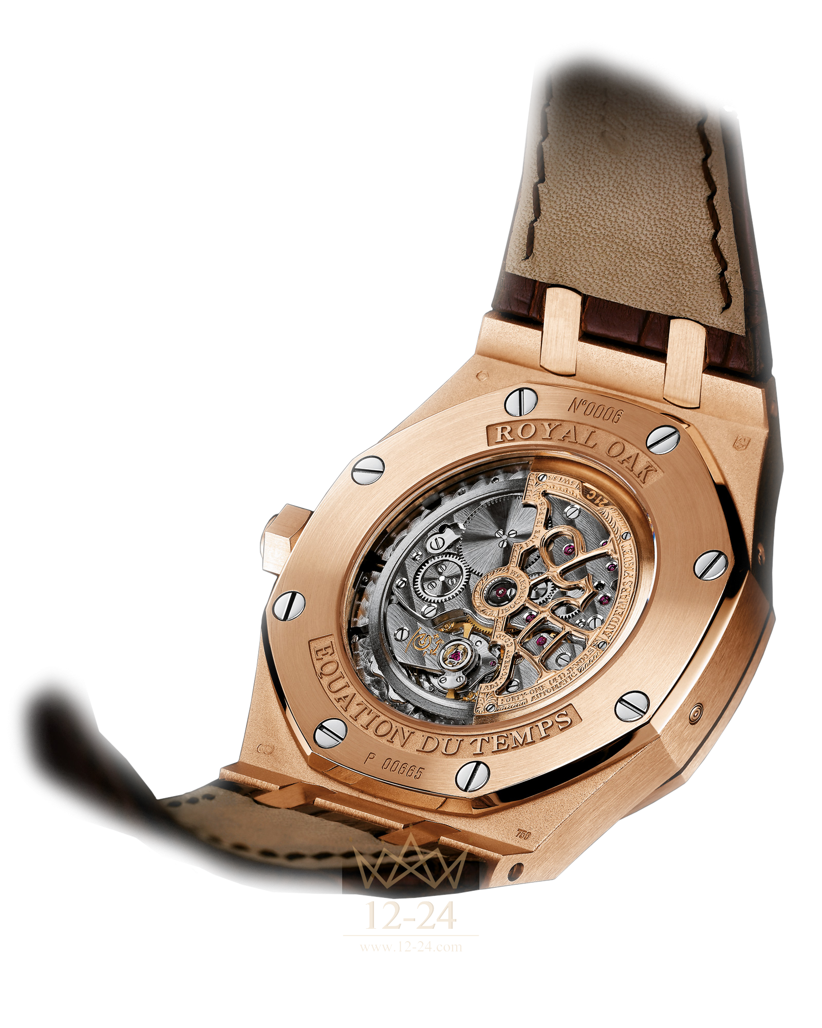 Часы Equation of time, астрономические часы с вечным календарем и указателями фазы Луны, уравнением времени и времени восхода и захода солнца, с автоподзаводом, корпус из 18 каратного розового золота, посеребренный циферблат модели "Grande Tapisserie", коричневый ремешок из кожи аллигатора.