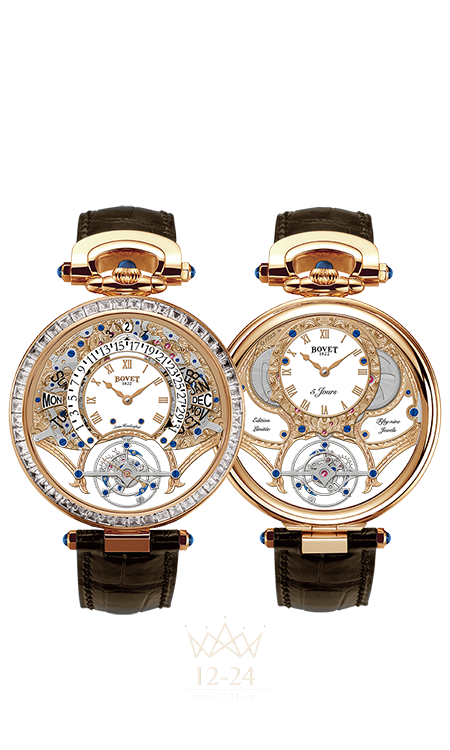 ФУНКЦИИ — часы, минуты, секундная стрелка на турбийоне, день недели, ретроградный индикатор даты, месяц, високосный год, реверсивные стрелки, указатель запаса хода.
