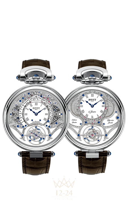 ФУНКЦИИ — часы, минуты, секундная стрелка на турбийоне, день недели, ретроградный индикатор даты, месяц, високосный год, реверсивные стрелки, указатель запаса хода.