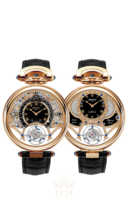 ФУНКЦИИ — часы, минуты, секундная стрелка на турбийоне, день недели, ретроградный индикатор даты, месяц, високосный год, реверсивные стрелки, указатель запаса хода.