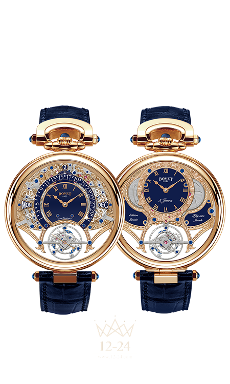 ФУНКЦИИ — часы, минуты, секундная стрелка на турбийоне, день недели, ретроградный индикатор даты, месяц, високосный год, реверсивные стрелки, указатель запаса хода.