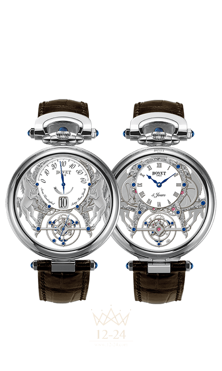 ФУНКЦИИ — «прыгающая» часовая стрелка, ретроградный индикатор минут, секундная стрелка на турбийоне, реверсивные стрелки, 5-дневный запас хода, коаксиальная индикация.