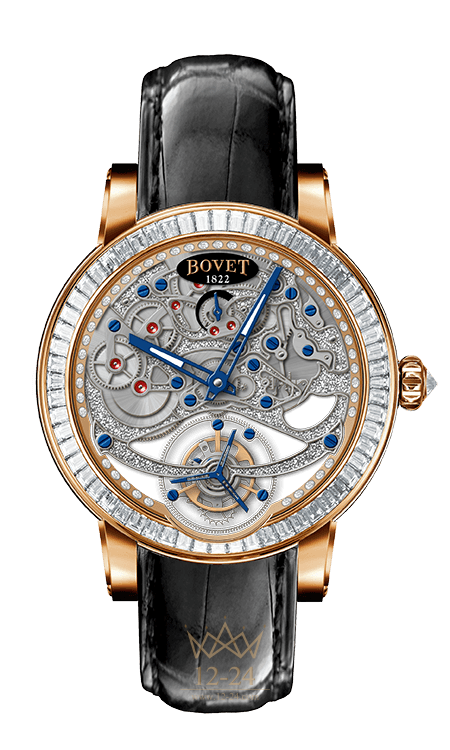 Отделка бриллиантами — безель с 68 бриллиантами багетной огранки (~3,15 карата) и внутренний безель с 45 бриллиантами круглой огранки (~0,28 карата).