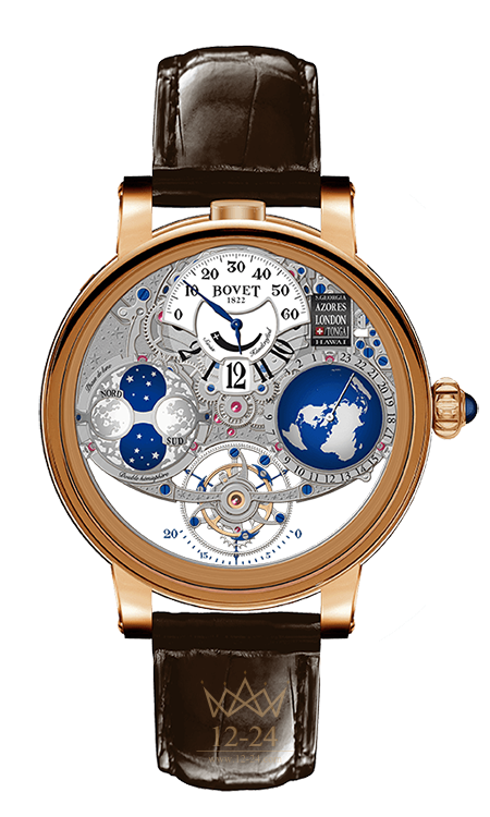 ФУНКЦИИ — «прыгающая» часовая стрелка, ретроградный индикатор минут, секундная стрелка на турбийоне, полусферический указатель мирового времени с выбором часового пояса и компактный указатель 24 городов, высокоточный полусферический индикатор фазы Луны.