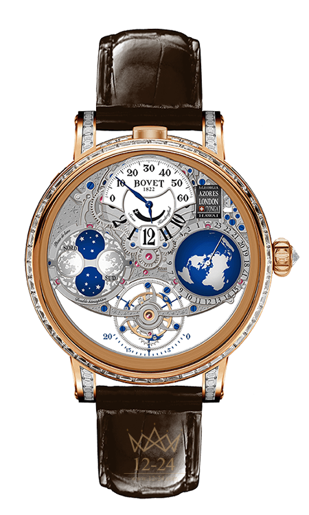 ФУНКЦИИ — «прыгающая» часовая стрелка, ретроградный индикатор минут, секундная стрелка на турбийоне, полусферический указатель мирового времени с выбором часового пояса и компактный указатель 24 городов, высокоточный полусферический индикатор фазы Луны.