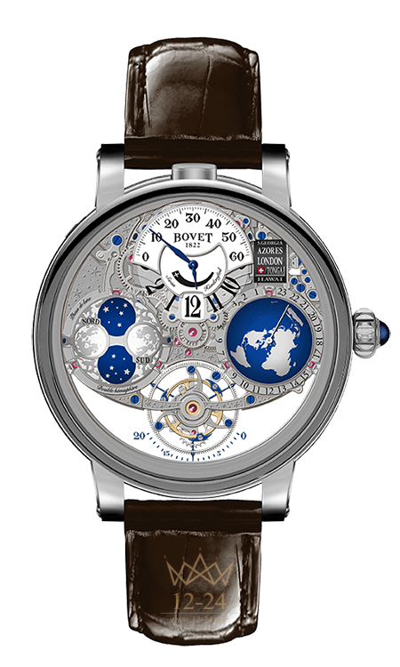 ФУНКЦИИ — «прыгающая» часовая стрелка, ретроградный индикатор минут, секундная стрелка на турбийоне, полусферический указатель мирового времени с выбором часового пояса и компактный указатель 24 городов, высокоточный полусферический индикатор фазы Луны.