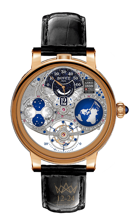 ФУНКЦИИ — «прыгающая» часовая стрелка, ретроградный индикатор минут, секундная стрелка на турбийоне, полусферический указатель мирового времени с выбором часового пояса и компактный указатель 24 городов, высокоточный полусферический индикатор фазы Луны.