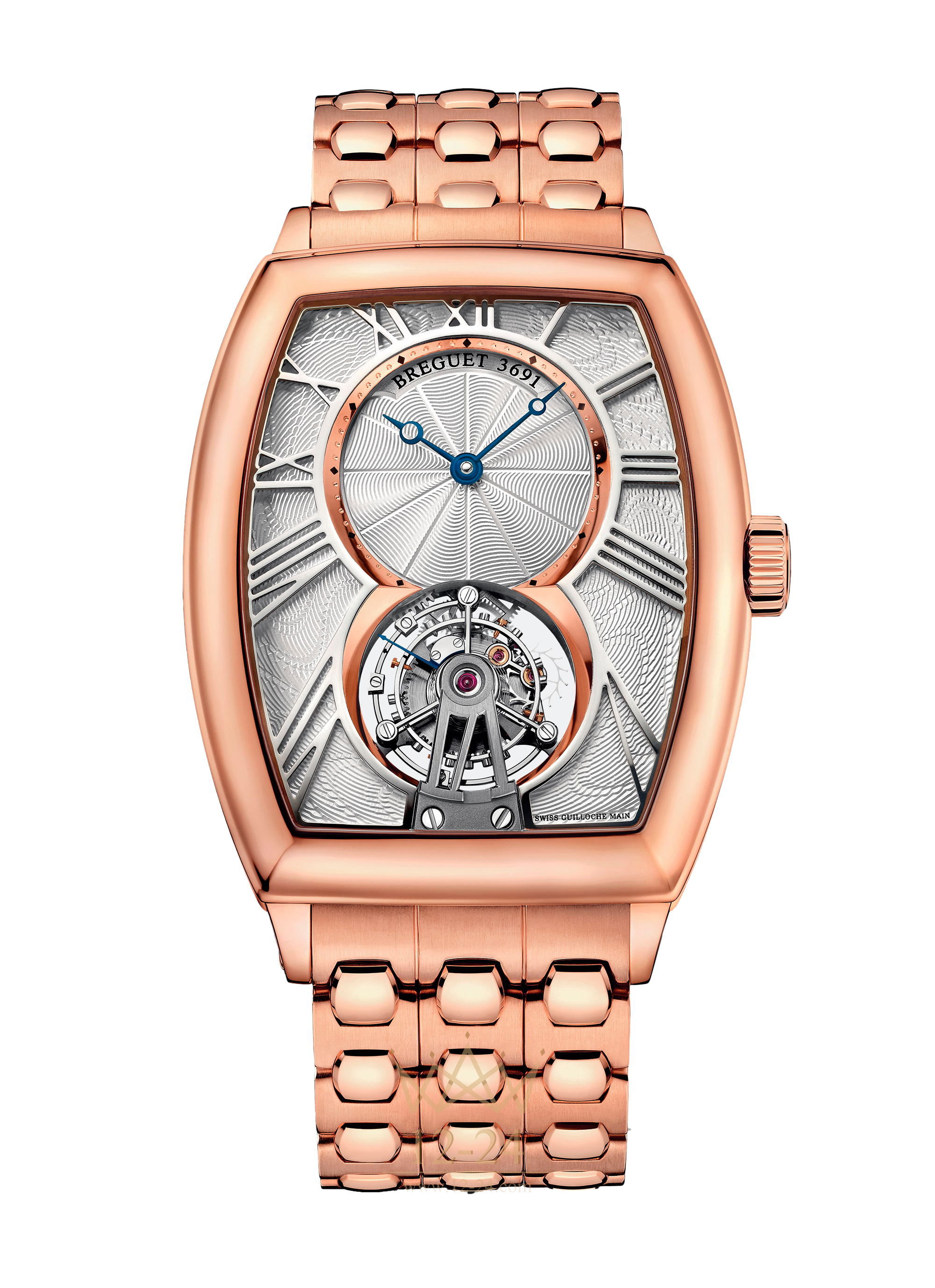 Часы линии Heritage Grande Complication (5497BR/12/RB0) из 18-каратного розового золота, с турбийоном. Корпус в форме «бочка». Гравированный вручную механизм с ручным заводом. Малая секундная стрелка на оси турбийона. Автокомпенсирующая спираль Breguet. Изогнутый циферблат из посеребренного золота с гильошированным вручную узором. Задняя крышка с сапфировым стеклом. Водонепроницаемые до 3 бар (30 м). Размеры: 42 мм x 35 мм.