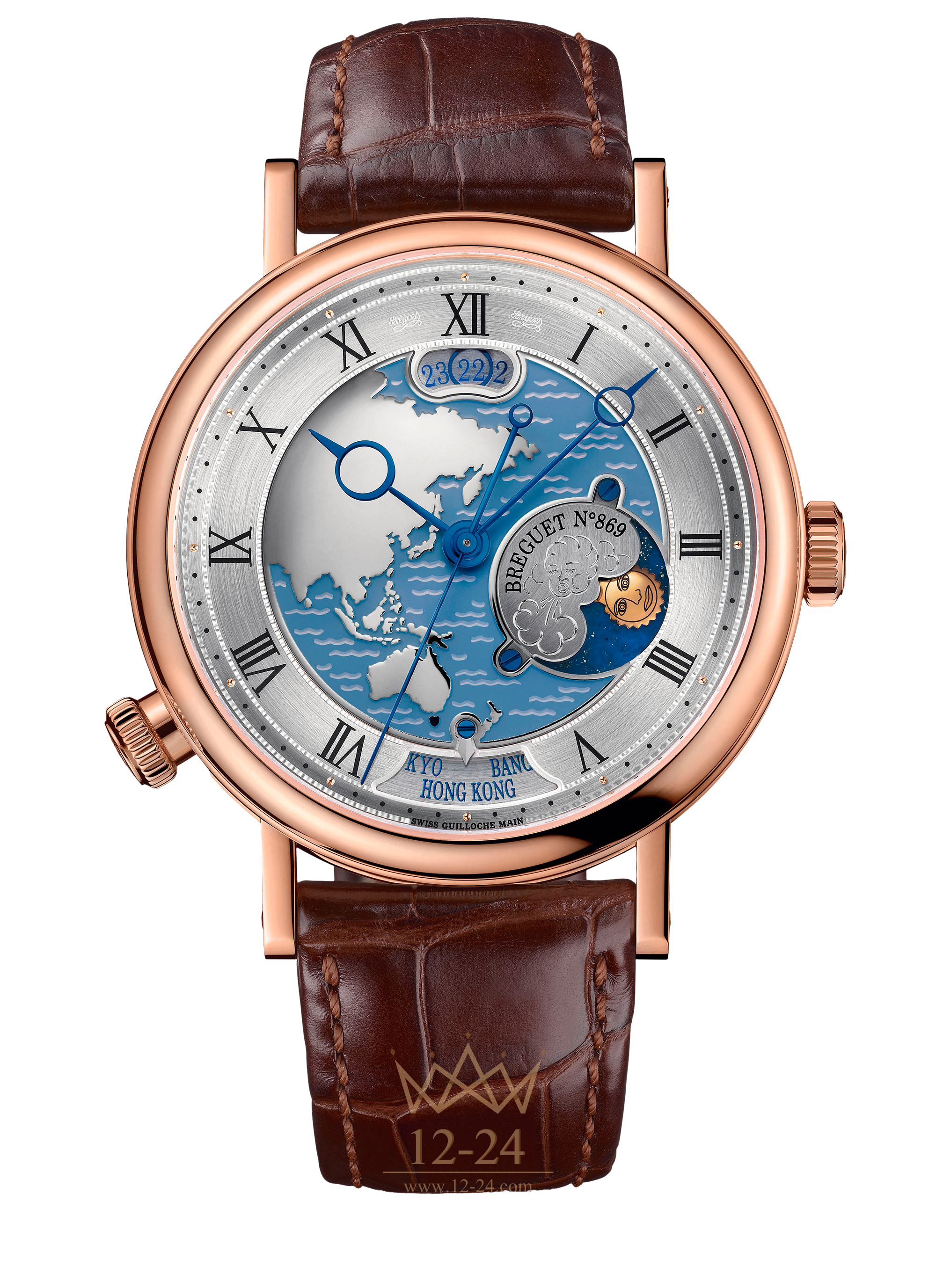 Часы Hora Mundi (5717BR/AS/9ZU) линии Classique из розового золота. Автоматический механизм. Индикация времени второго часового пояса с синхронизированным указанием даты, дня/ночи и города. Спираль, анкер и анкерное колесо из кремния.