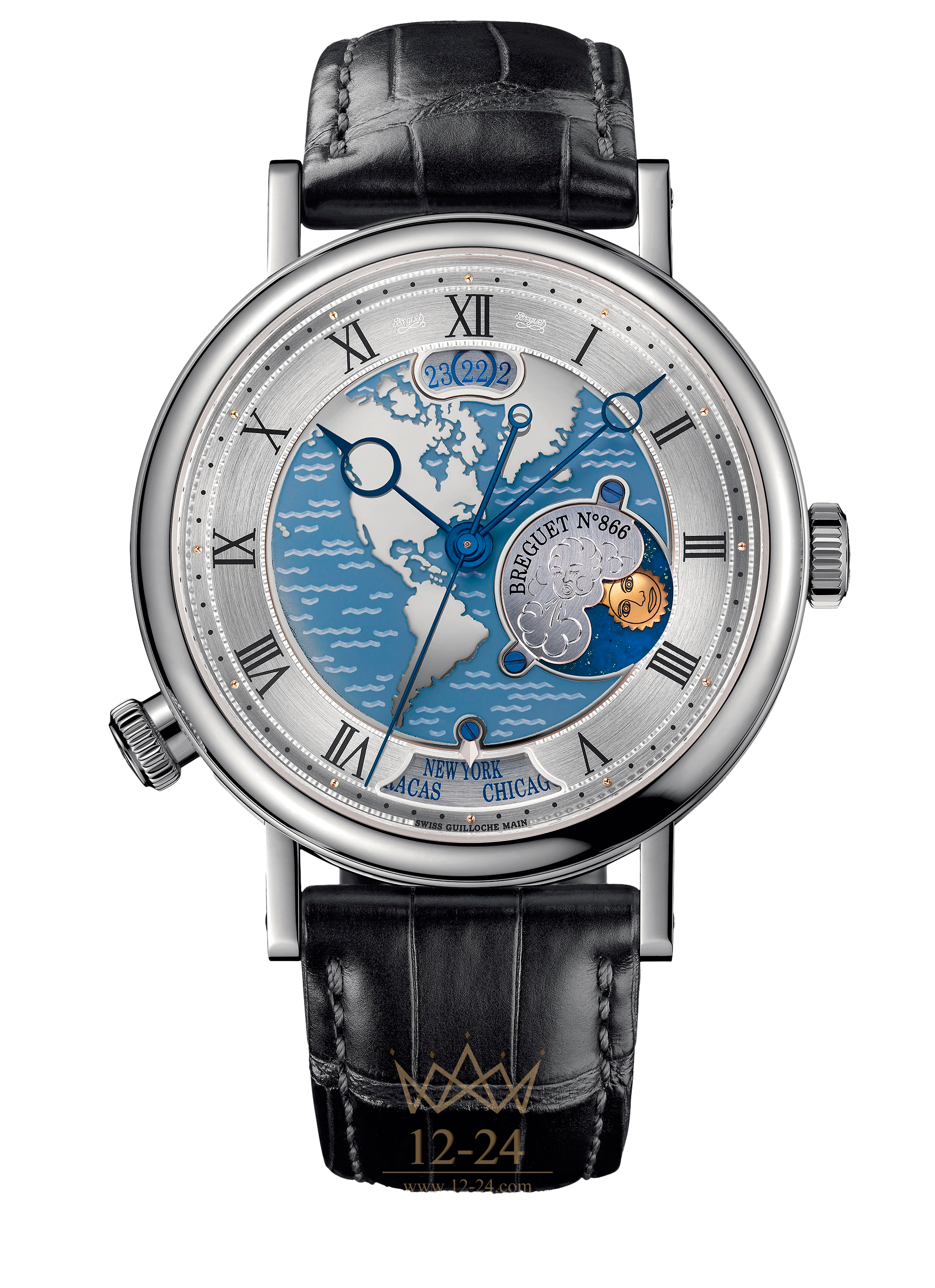 Часы Hora Mundi (5717PT/US/9ZU) линии Classique из платины 950 пробы. Автоматический механизм. Индикация времени второго часового пояса с синхронизированным указанием даты, дня/ночи и города. Спираль, анкер и анкерное колесо из кремния.