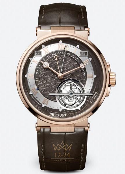 Часы линии Marine Grande Complication с функцией бегущего уравнения времени, вечным календарем и турбийоном из 18-каратного розового золота. Автоматический механизм. Спираль из кремния. Индикация дня недели, месяца и года в високосном цикле. Ретроградный указатель даты. Индикация запаса хода. Стрелка солнечных минут с позолоченным граненым указателем в форме солнца. Анкерное колесо из кремния. Каретка турбийона из титана. Малая секундная стрелка и «кулачок» уравнения времени на оси турбийона. Грифельно-серый циферблат из золота, гильошированный вручную. Задняя крышка из сапфирового стекла. Водонепроницаемые до 10 бар (100 м). Диаметр: 43,9 мм.