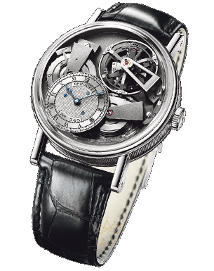 Часы линии TRADITION из платины. Механизм с ручным заводом, с турбийоном и цепной передачей с фузеей. Соединенная с барабаном цепная передача с фузеей обеспечивает постоянную силу действия на протяжении всего периода работы часов. Был размещен целый ряд заявок на получение патентов на большой турбийонный резонатор, представленный на циферблате часов в положении "1 час", одна заявка – на выполненный из титана баланс, три – на кремниевую авто-компенсирующую спираль Breguet со знаменитыми концевыми кривыми "Бреге". Создание изгиба кремниевой полоски для придания ей трехмерной формы представляет собой выдающееся достижение в часовой области.