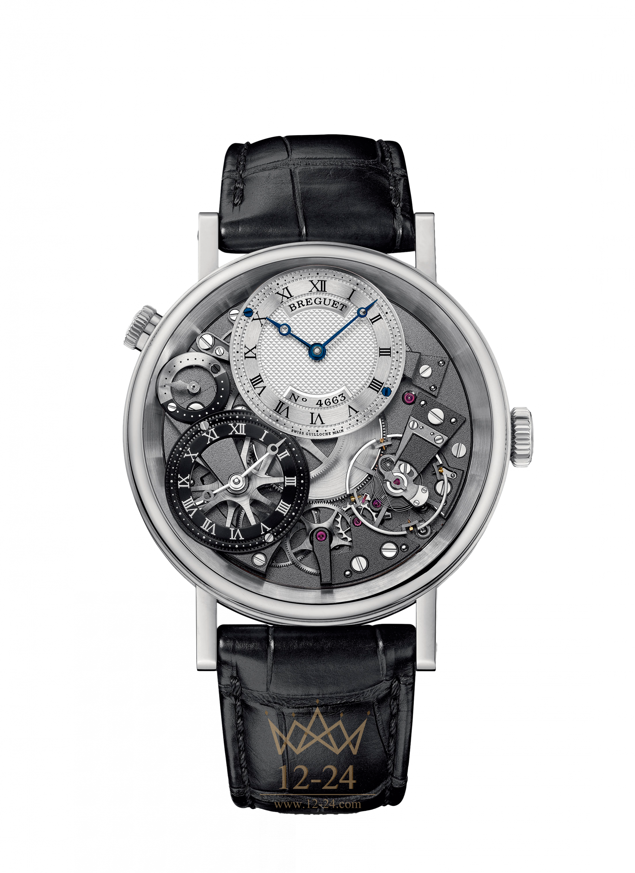 Часы линии Tradition GMT (7067BB/G1/9W6) из белого золота. Механизм с ручным заводом. Индикация времени второго часового пояса. Указатель дня и ночи. Смещенный циферблат местного времени из посеребренного золота с гильошированным вручную узором. Смещенный черный циферблат основного времени из золота с гильошированным вручную узором.
